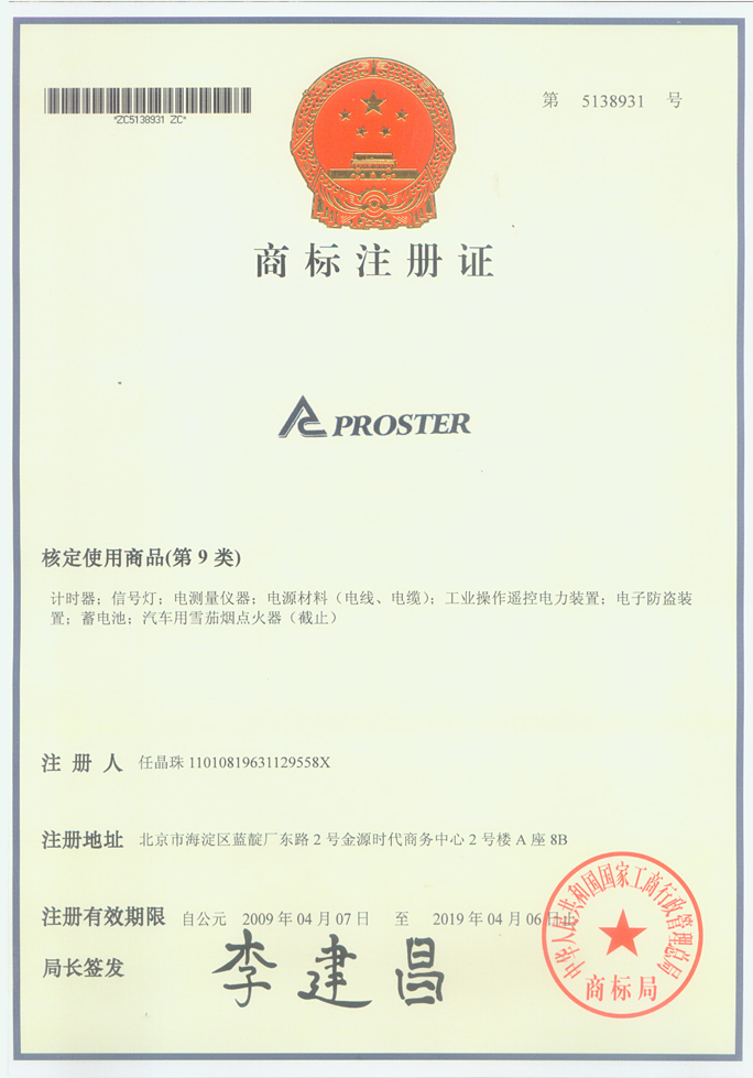 PROSTAR商标注册证书